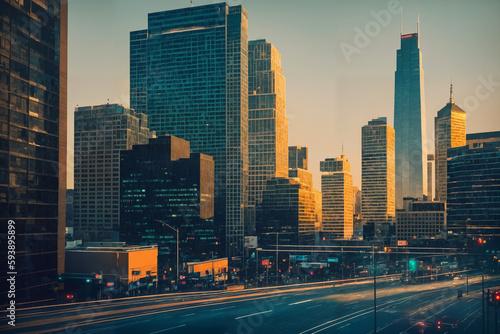 City street with sunset view, skyscrapers and street lights. Generative AI.