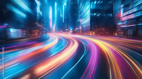 City streets with neon lights, dynamic motion blur, and colorful light trails at night