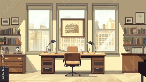 City view, home office, workspace, sunny day. Possible use Stock photo for home office design