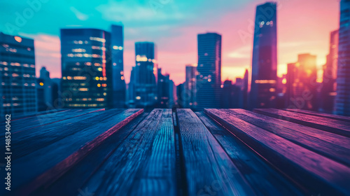 Cityscape backdrop from wooden planks in trendy color, night scene, cityscape view for presentation, modern metropolis environment, backdrop template