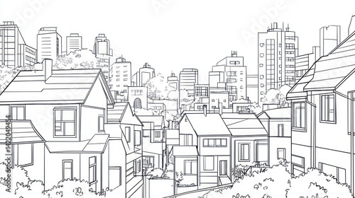 Cityscape sketch, urban buildings, houses, trees, perspective view, line drawing, illustration, background design