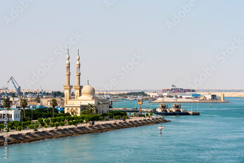 Cityscape with Egyptian Mosque in the city of Tawfiq (Suburb of Suez), on the southern end of the Suez Canal before exiting into the Red Sea.