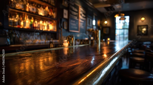 Classic bar counter in a warm, amber-lit lounge with backlit shelves