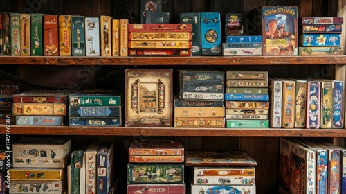 Classic Board Games on Wooden Shelves
