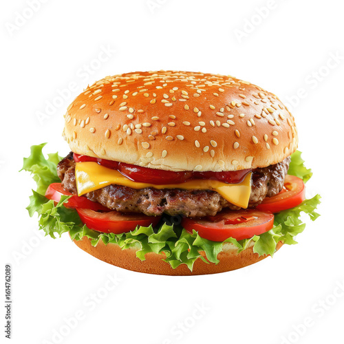 Classic cheeseburger, topped with tomato, lettuce, and cheese, sitting on a sesame seed bun