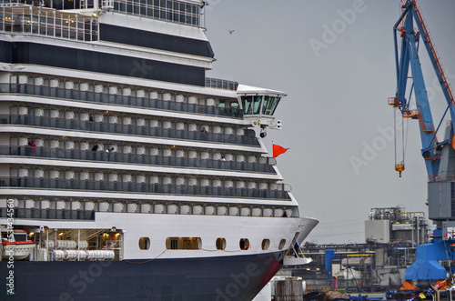 Classic Cunard luxury cruise ship cruiseship Queen ocean liner Elizabeth arrival in port of Hamburg, Germany on rainy day with grey clouds