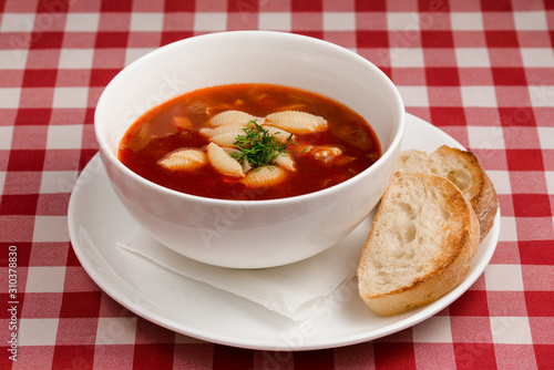 Classic delicious Italian minestrone soup with bread on traditional italian tablecloth background