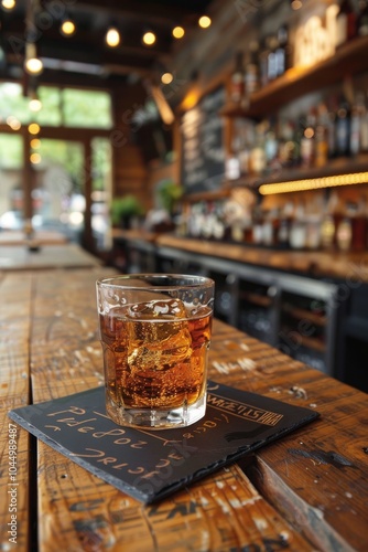 Classic glass of whiskey on wood in a cozy bar