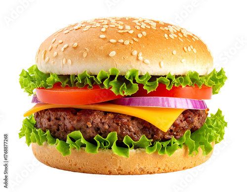 Classic hamburger stacked with lettuce, cheese, tomato and onion, on a sesame seed bun against a dark backdrop