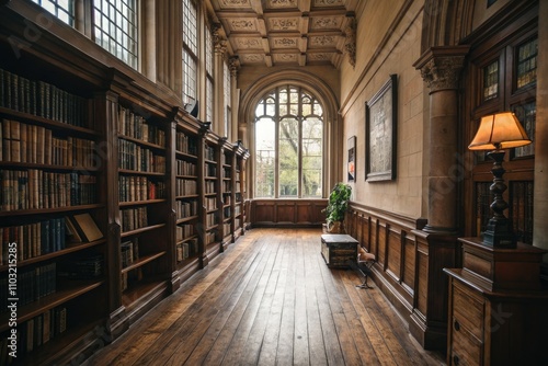 Classic Library Interior with Old Wooden Floor, Bookshelves, and Natural Light Streaming Through Window - Cozy Reading Space for Book Lovers