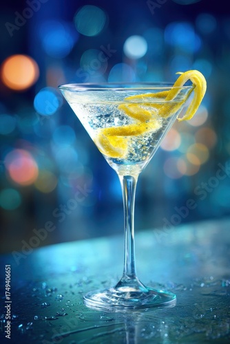 Classic Martini Lemon Twist on a White Background with Blurred Bar Setting