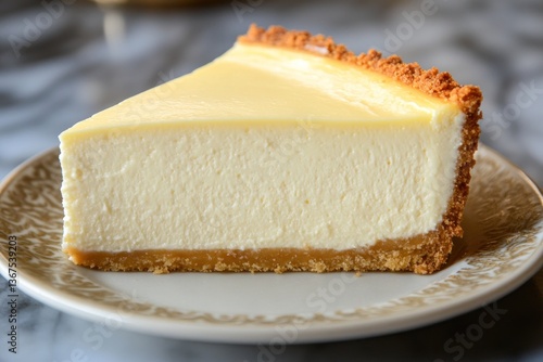 Classic New York cheesecake slice, creamy with a golden graham cracker crust.