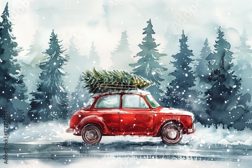 Classic red car with Christmas tree in a snowy forest, concept of festive traditions