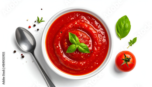 classic tomato pasta sauce in bowl, rich red color, smooth texture, overhead food photography