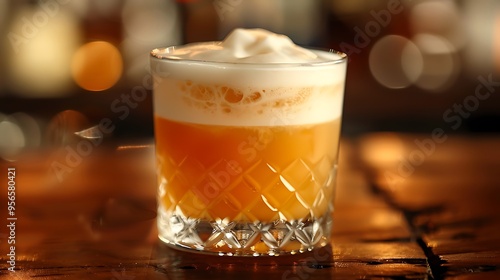 Classic Whiskey Sour with egg white foam, served in a crystal glass on a polished dark wood surface.