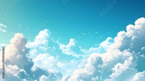 Clear blue sky with fluffy clouds.