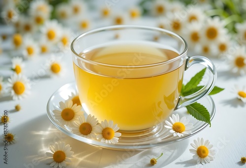 Clear cup of chamomile tea surrounded by chamomile flowers on a white surface in a bright setting