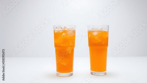 Clear glass filled with orange soda, bubbles and ice, perfect product advertising on a pure white studio background