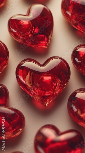 Clear red heart-shaped candies scattered on a smooth surface evoke feelings of love and sweetness