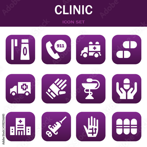clinic icon set. Vector illustrations related with Toothbrush, Emergency call and Ambulance