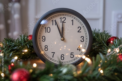 Clock striking midnight at Christmas, creating a festive holiday atmosphere with lights and ornaments