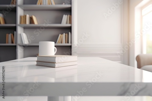 Close - up Modern white table top with free space to edit your product display with books above the living room blurred in the background