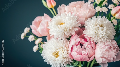 Close - up of chrysanthemum, peony and tulip bouquet on dark background, cottagecore vintage floral style