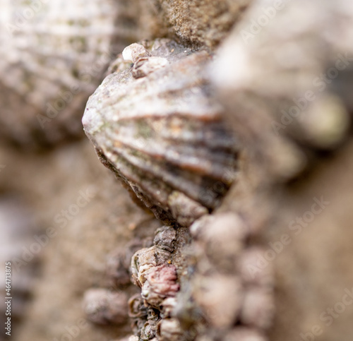 Close and selective focus on a limpet on a rock on Whitby Beach