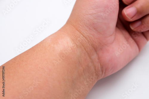 Close up: A scar on left wrist with white background.