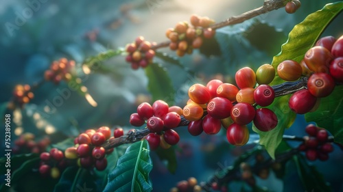 Close up branches of coffee cherries, full of leaves and fruits background.