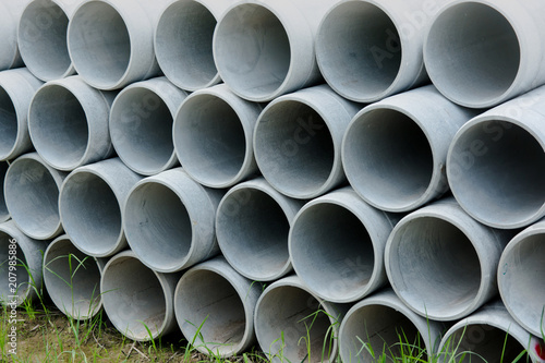 Close up concrete, cement pipes stacking, pattern background. concrete pipes for irrigation