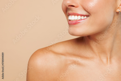 Close up cropped beautiful happy half naked topless young woman 20s with nude make up and toothy smile isolated on beige background studio portrait. Skin care healthcare cosmetic procedures concept.