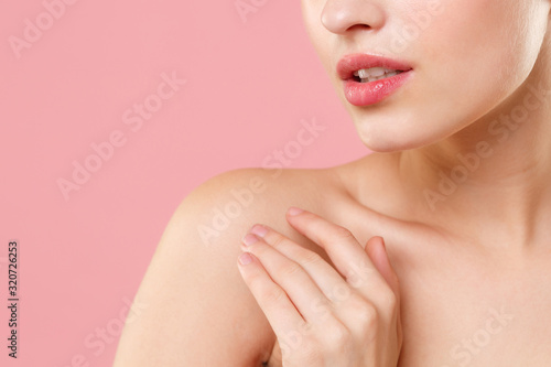 Close up cropped blonde half naked woman 20s perfect skin lips nude make up isolated on pastel pink wall background studio portrait. Skin care healthcare cosmetic procedures concept Mock up copy space