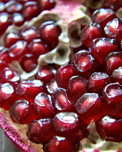 Close up macro view of a juicy, ripe red pomegranate fruit with glistening seeds for food marketing or healthy eating.