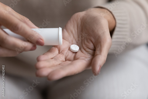 Close up mature woman taking out pill from plastic bottle, preparing to take emergency medicine, middle aged female holding supplement or antibiotic, elderly healthcare and treatment concept