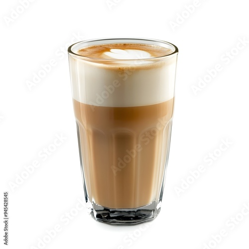 Close up of a Beautifully Presented Glass of Warm Creamy Latte Centered on a Simple White Background Highlighting the Drink s Artisanal Qualities and Inviting Cafe Culture Atmosphere