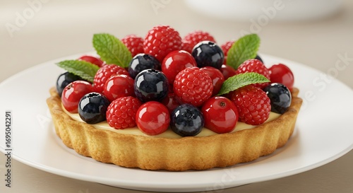 Close up of a berry tart with raspberries blueberries and red currants on a white plate surface view
