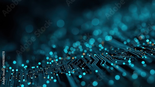 Close up of a circuit board with blue lights and blurred background.