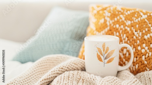 Close up of a cozy autumn themed mug with leaf design, nestled on a soft knitted blanket with pillows. Concept of warmth, comfort, and relaxation.