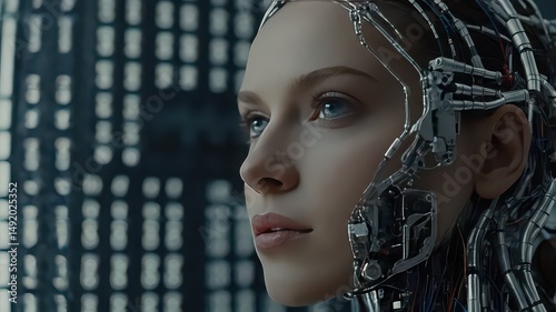 Close up of a cyborg woman with wires and metal attached to her head in a futuristic setting
