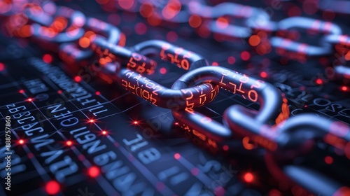 Close up of a digital chain symbolizing blockchain technology, with red illumination and binary code in the background.