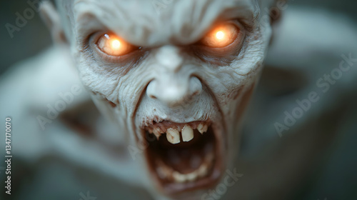 Close Up Of A Ghastly White Horror Monster With Glowing Red Eyes Screaming