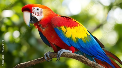 Close up of a majestic scarlet macaw with vivid red blue and yellow feathers its eyes keen and focused perched on a branch against a backdrop of green leaves and soft dappled sunlight