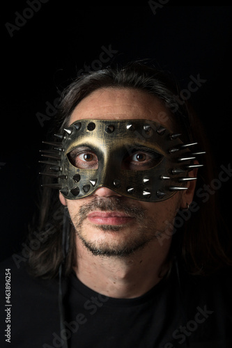 Close up of a man wearing Halloween mask on black background. Soft focus
