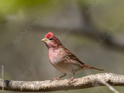Close up of a perched adult male Purple Finch in bright spring plumage