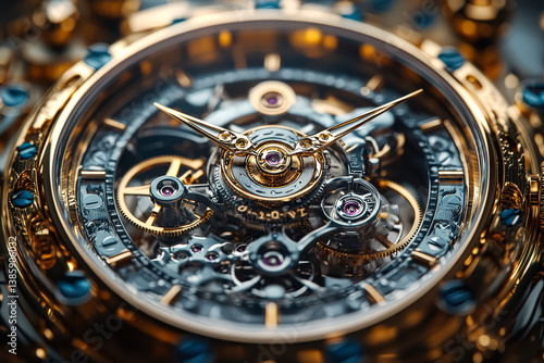 Close up of a watch with a gold band and a blue face. The watch has a very intricate design and is made of metal