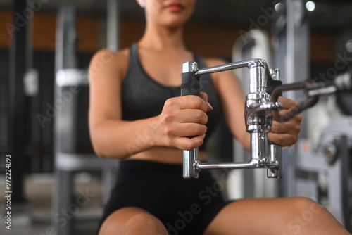 Close up of a woman gripping a handle while exercising with cable rowing crossover machine at the gym