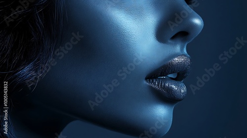 Close up of a woman's mouth and nose with blue light, suggestive of mystery and intimacy