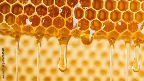 Close up of dripping honey from a honeycomb with golden hexagons