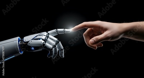Close up of finger touching between a human hand and a robot arm symbolizing the relationship between technology and humanity on a black background